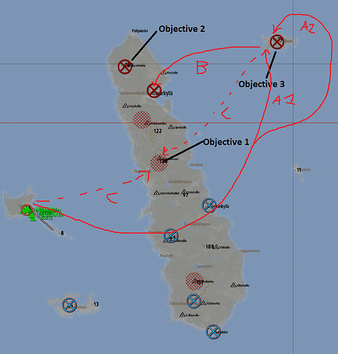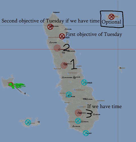 For the NE island this is also pretty much the plan I propose. Falcon does the initial bombing run, possibly taking out AA installations that have been reinstalled since Tuesday. Afterwards NB inserts us on the Southwest or Northern beach (these looks the least fortified). Once Falcon is done with its strikes on the island, it moves on towards Suurkyla and bombs as much of it as is possible (and takes out possible boats moving towards the island). Nightbird meanwhile provides aerial support at the island.